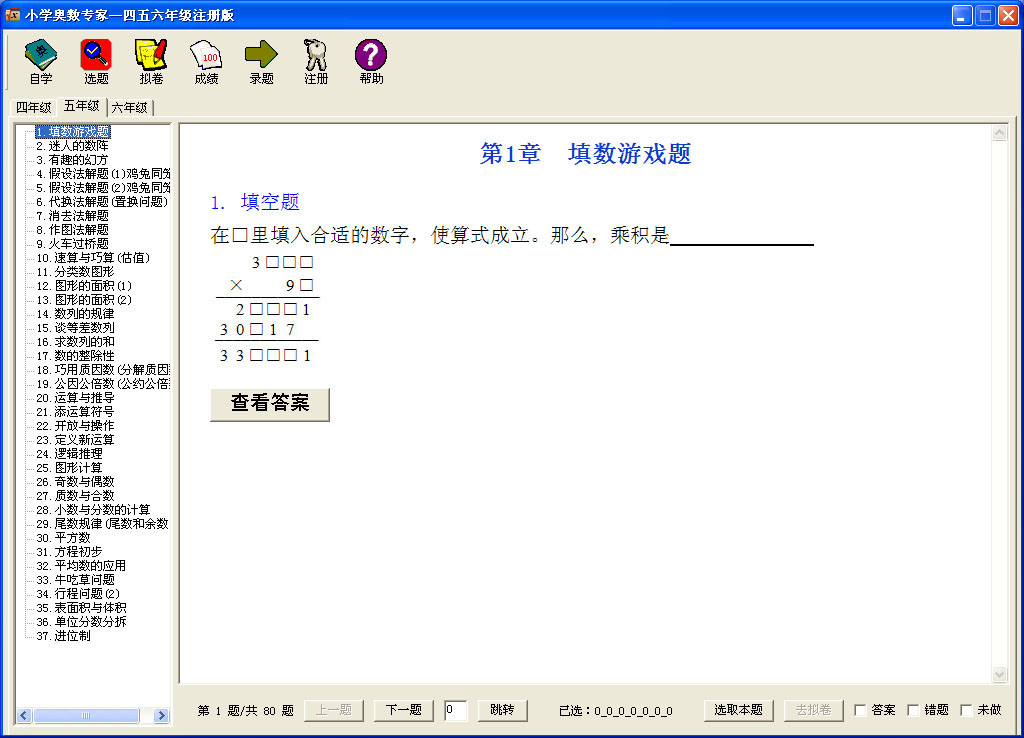 “小学奥数专家”包含小学四、五、六共3个年级的奥数内容,软件安装、使用、注册都非常简单方便,欢迎下载试用。如果觉得好用,可以只注册其中某一个年级,或者其中两个年级,或者全部三个年级。